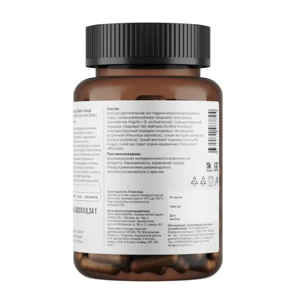 Тонкодисперсный порошок плодовых тел рейши (Ganoderma lingzhi), майтаке (Grifola frondosa), вешенки устричной (Pleurotus ostreatus) низкотемпературной сушки; экстракт куркумы (Curcuma longa), экстракт корня одуванчика (Taraxacum officinale), экстракт артишока (Cynara scolymus).